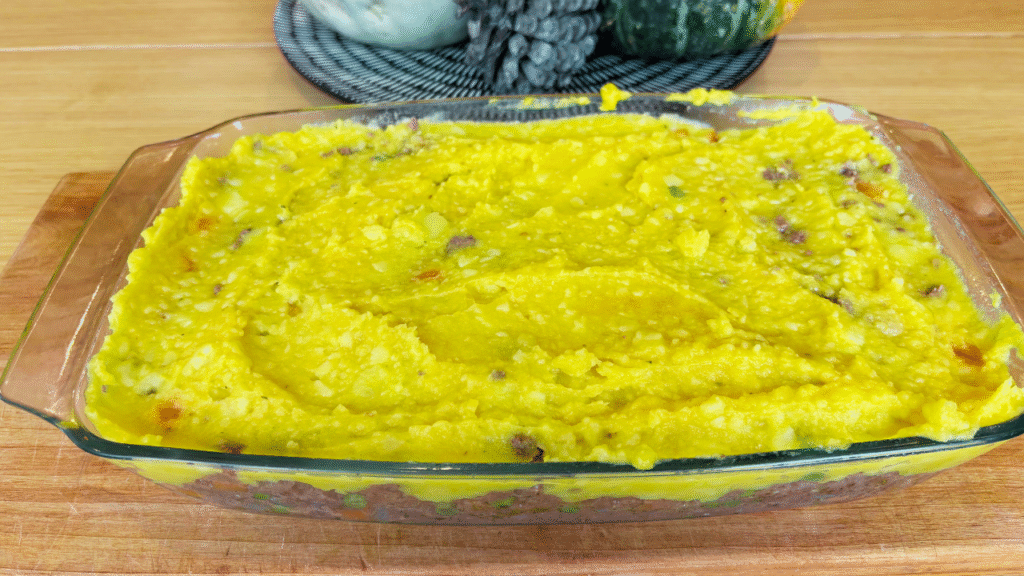 For the topping, I mash boiled potatoes with leftover cooked pumpkin, butter, and milk. I layer it all in a baking dish, cover with foil, and tuck it into the fridge until I need it.