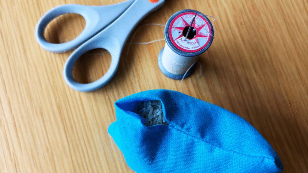 I started with sturdy cotton fabric in neutral tones. For each bean bag, I cut two squares, pinned the right sides together, and stitched around three sides, leaving a small opening for filling. After turning the squares right side out and gently pushing out the corners, I filled them with plain white rice. Finally, I folded in the raw edges and hand-stitched the opening closed using a ladder stitch.